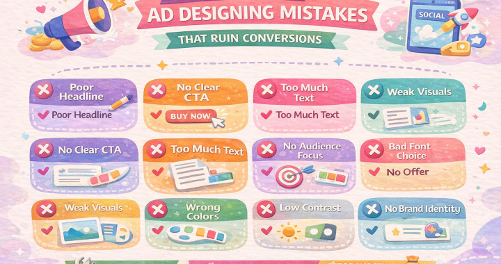 In digital advertising, design is not just about looking good — it directly impacts conversions, click-through rates, and return on investment. Many businesses spend heavily on ads but fail to see results because of common ad design mistakes that silently kill performance.